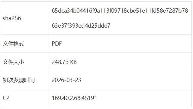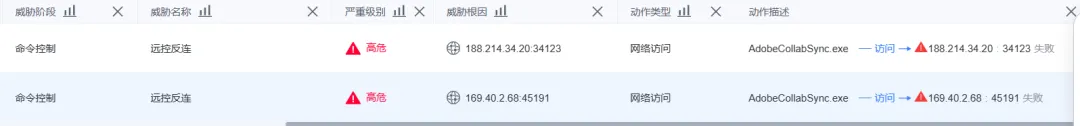 目前,该手法已在多个钓鱼攻击中被捕获,持续时长超过5个月,建议用户立即排查并阻断188.214.34.20:34123以及169.40.2.68:45191上的出站流量,在EDR中排查终端是否有和上述IP的通信行为并临时管控AdobeReader。