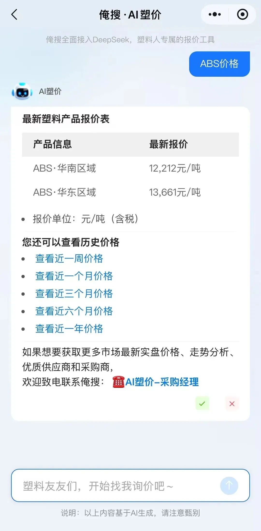 比如ABS、PA6、POM、PET等塑料,俺搜AI塑价直接按照华东、华南、华北区域给你区分好。