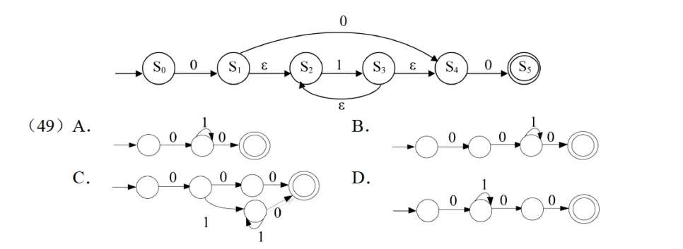 (53):候选关键字 A₁A₂和 A₁A₃都包含 A₁,因此候选关键字必定含有 A₁;主属性是候选关键字中的属性,即 A₁、A₂、A₃,A₄是非主属性,答案为 A。