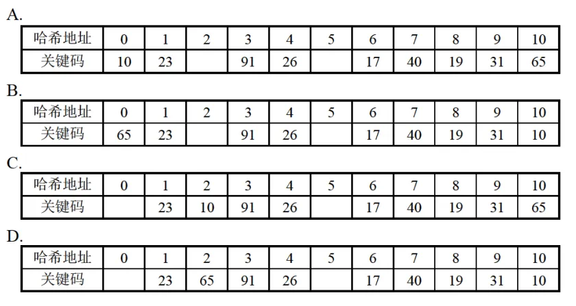 地址 0:65;地址 1:23;地址 3:91;地址 4:26;地址 6:17;地址 7:40;地址 8:19;地址 9:31;地址 10:10;地址 2、5 为空。对比选项,选项 A 的哈希地址 0 为 10,地址 10 为 65,顺序错误;选项 B 的地址 0 为 65,地址 10 为 10,符合计算结果,因此答案为 B。