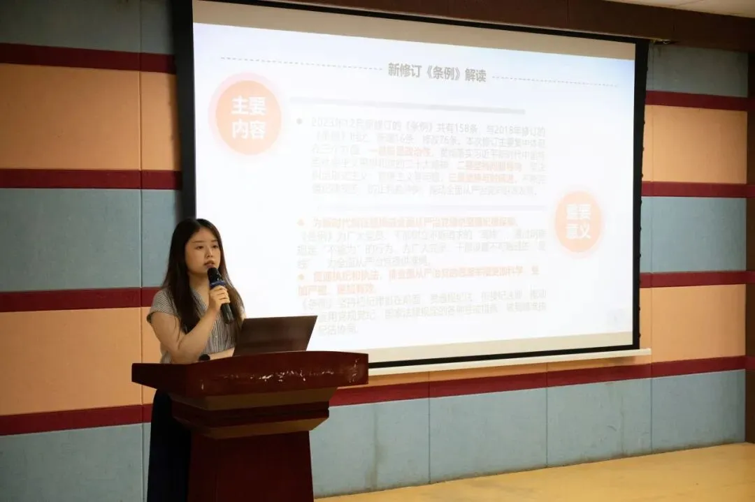 接着,李鑫博士详细解读了新修订的《中国共产党纪律处分条例》。她从《条例》的修订背景、主要内容和新增条款等方面进行了系统讲解。特别是对于新增的纪律条款和处分措施,李鑫结合实际案例进行了深入剖析,使大家对新《条例》有了更全面的理解。李鑫在讲课中还结合自身的研究和实践经验,分析了党员干部在日常工作中容易忽视的纪律问题。她指出,党员干部必须树立纪律意识,做到心中有规矩,行有所止。