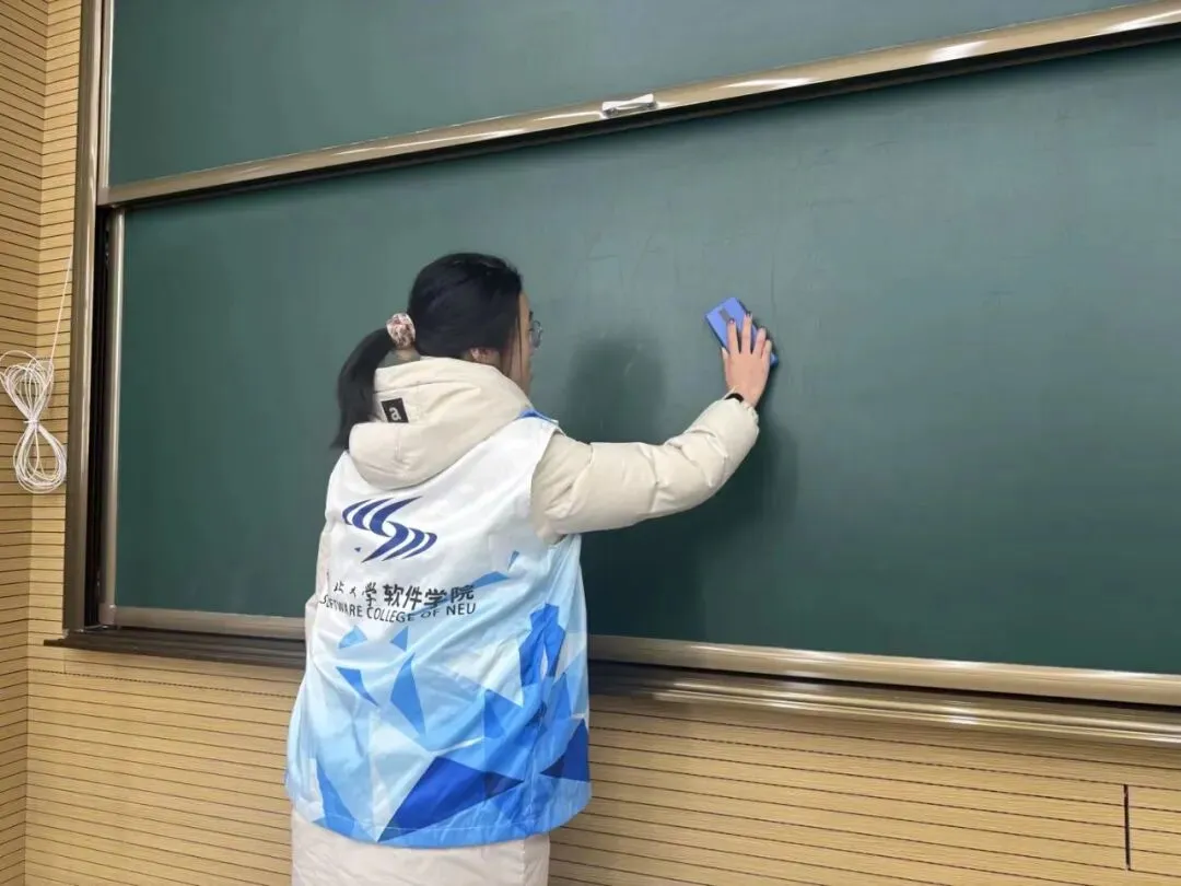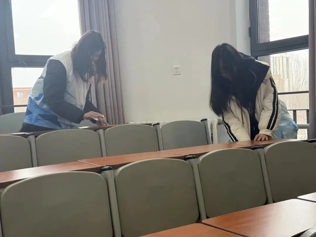活动伊始,志愿者们按楼层分为三个小组,明确分工后迅速投入工作。各小组细致清扫负责区域的地面垃圾,认真擦拭黑板、讲台及门窗玻璃,逐一整理课桌内遗留物品,同时全面清洁走廊扶手等公共区域,确保不留卫生死角。经过志愿者们的共同努力,一号教学楼的教室及公共区域焕然一新。