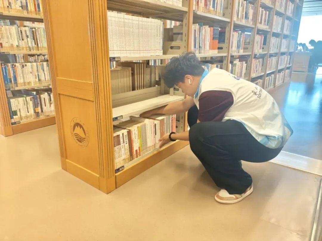 本次活动覆盖图书馆四楼四个区域。活动中,30名志愿者分为四组,分别前往指定区域协同作业。各组志愿者身着统一服装,迅速投入岗位,细致核对索书号,将错架、散乱的图书逐一归位;耐心调整书籍朝向与间距,确保书脊对齐、排列整齐;整个过程井然有序、配合默契,充分展现了青年志愿者严谨细致的工作态度与团结协作的奉献风采。