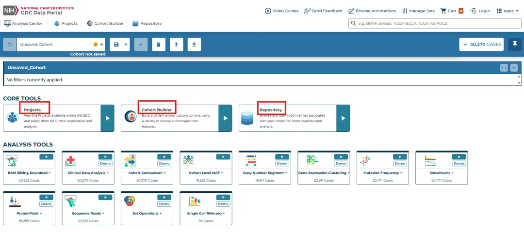 进行主页面,包括三个部分,Projects(浏览定位目标癌症研究项目)→Cohort Builder(在项目中筛选符合研究需求的样本队列)→Repository(针对筛选后的样本,选择并下载具体数据文件)