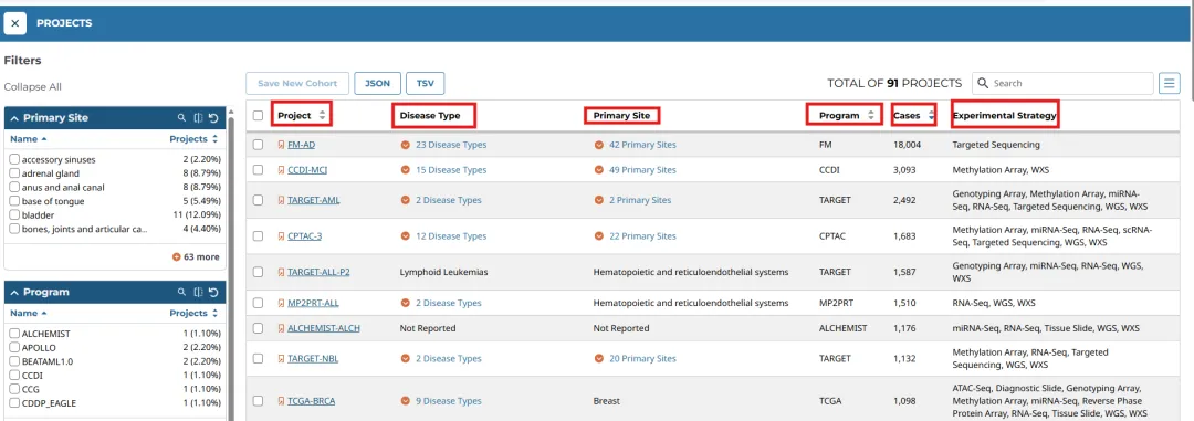 project:TCGA项目如TCGA-LAML,TCGA-BRCA等
