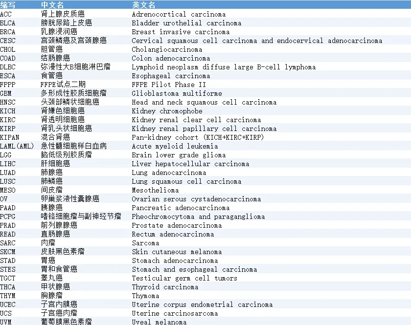 下面是TCGA中肿瘤类型对照表: