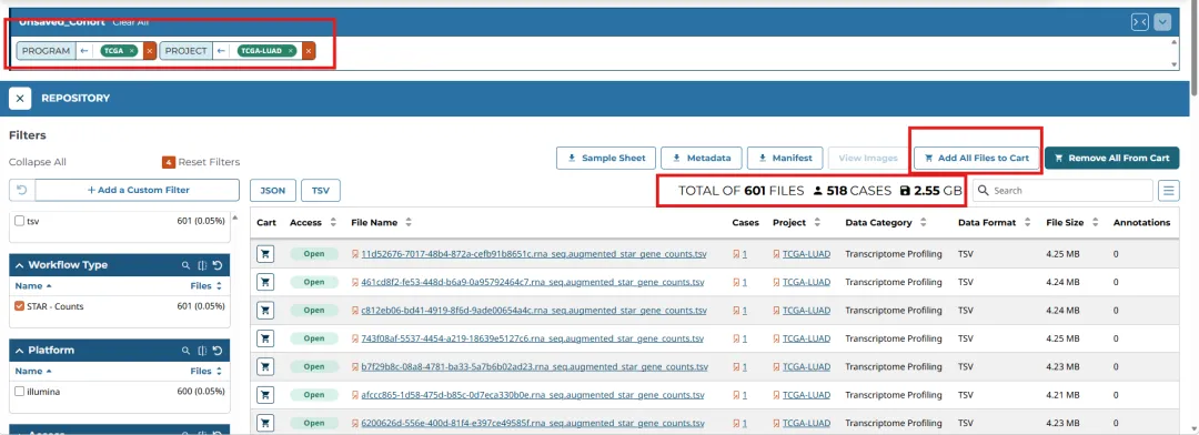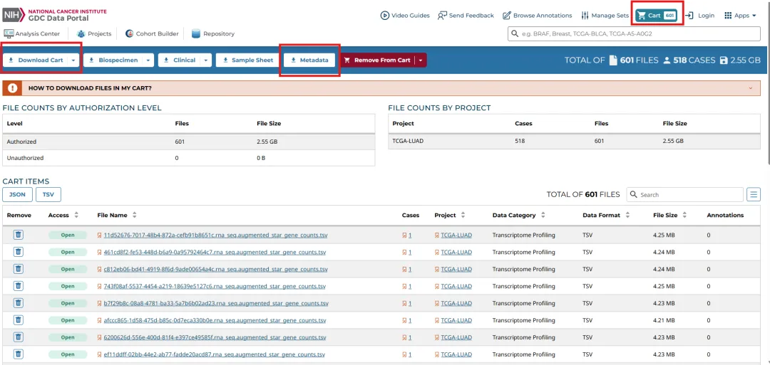 在选择之后,可以看到从 TCGA 数据库获取肺腺癌(LUAD)原发肿瘤样本的公开 RNA‑Seq 基因表达定量数据,共包含601 个表达文件,其中肿瘤组织 542 例、正常组织 59 例,数据总量 2.55 GB。