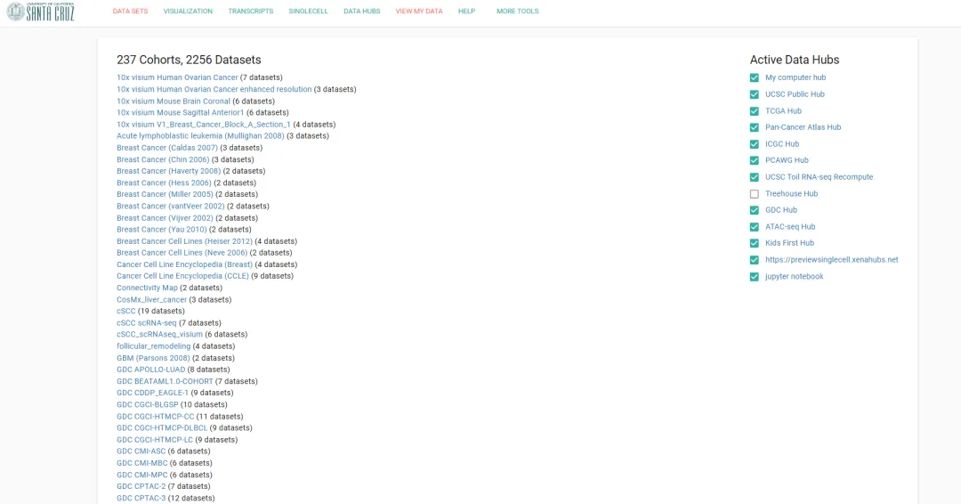 通过浏览器检索UCSC xena,进入官网(http://xena.ucsc.edu/)点击Launch Xena,随后点击左上角DATA SETS或直接点击链接进入UCSC数据页面https://xenabrowser.net/datapages/