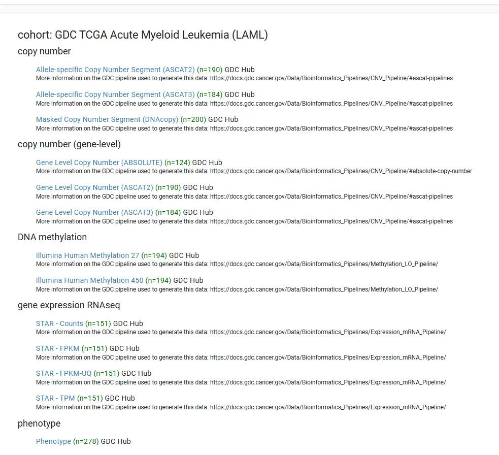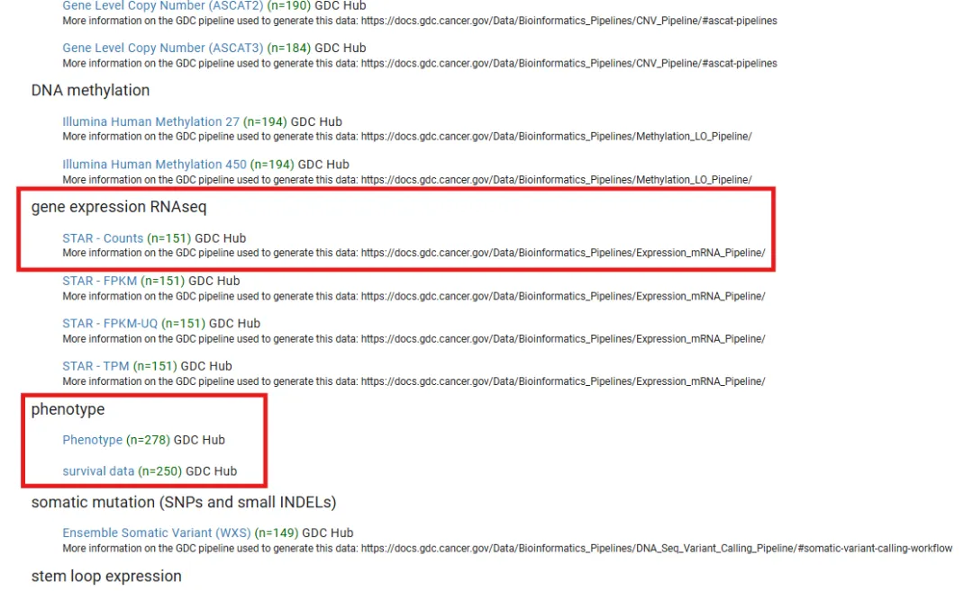 可以看到多种数据类型,其中gene expression RNAseq数据为转录组数据(包含原始表达数据STAR - Counts和处理后FPKM、TPM等)。phenotype包含Phenotype(样本各种数据包括年龄、性别、病史、阶段等)和survival data(生存数据)。