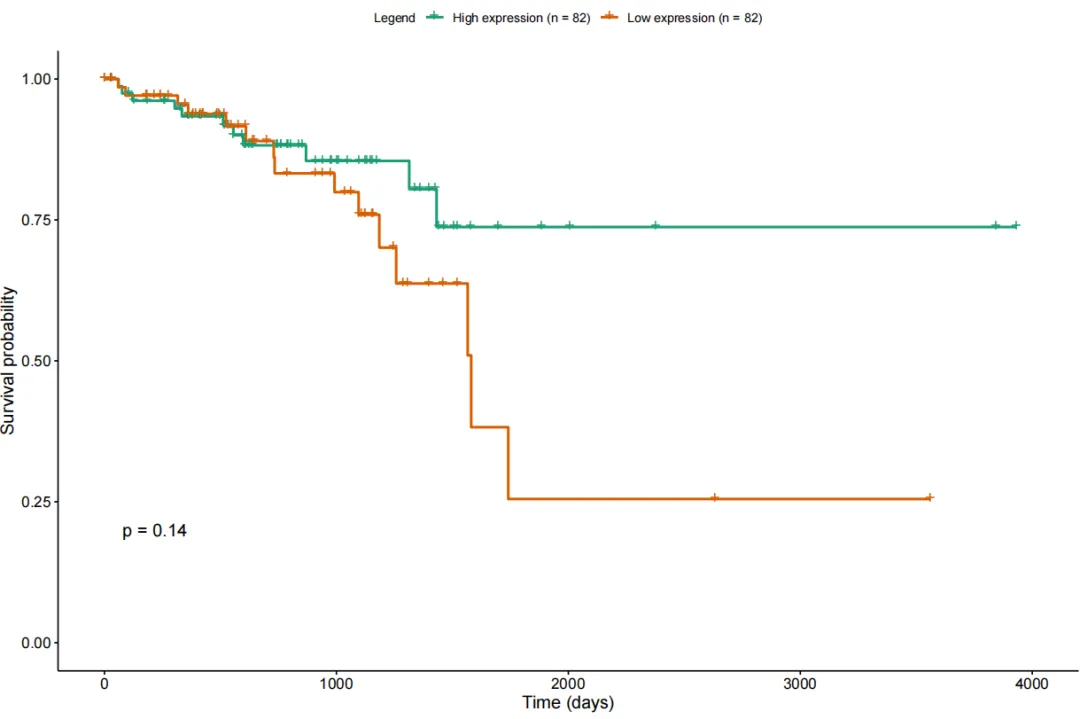 library(TCGAbiolinks)library(dplyr)library(tibble)library(survival)library(survminer)expr_surv <- tpmrownames(expr_surv) <- gene_anno$gene_nameexpr_surv <- expr_surv[!duplicated(rownames(expr_surv)), ]tumor_mask <- substr(colnames(expr_surv), 14, 15)== "01"expr_surv <- expr_surv[, tumor_mask]colnames(expr_surv) <- sapply(strsplit(colnames(expr_surv), "-"),function(x) paste0(x[1:3], collapse = "-"))clinical_patient <- GDCquery_clinic(project = "TCGA-READ", type = "clinical")KRAS_expr <- as.data.frame(t(expr_surv["KRAS", , drop = FALSE]))colnames(KRAS_expr) <- "KRAS"KRAS_expr$submitter_id <- rownames(KRAS_expr)df_surv <- clinical_patientdf_surv$KRAS <- KRAS_expr$KRAS[match(df_surv$submitter_id, KRAS_expr$submitter_id)]df_surv <- df_surv[!is.na(df_surv$KRAS), ]df_surv <- df_surv %>%filter(vital_status %in% c("Alive", "Dead")) %>%filter((!is.na(days_to_death) & vital_status == "Dead") |(!is.na(days_to_last_follow_up) & vital_status == "Alive"))df_surv <- df_surv %>%mutate(time = case_when(vital_status == "Dead" ~ days_to_death,vital_status == "Alive" ~ days_to_last_follow_up),event = ifelse(vital_status == "Dead", 1, 0)) %>%filter(!is.na(time))median_expr <- median(df_surv$KRAS, na.rm = TRUE)df_surv$exp_group <- ifelse(df_surv$KRAS >= median_expr,"High expression","Low expression")TCGAanalyze_survival(data = df_surv,clusterCol = "exp_group",timeCol = "time",eventCol = "event",risk.table = FALSE,conf.int = FALSE,color = "Dark2",main = "TCGA-READ KRAS Survival Analysis",xlab = "Time (days)",ylab = "Survival Probability",filename = "READ_KRAS_survival.pdf",pvalue = TRUE)