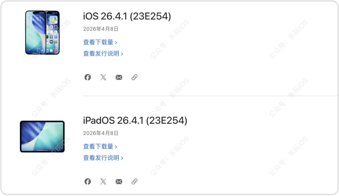 突发,iOS 26.4.1 紧急更新!今日(4月9日)凌晨,苹果紧急推送了 iOS/iPadOS 26.4.1 正式版更新,版本号为23E254更新包仅 600MB 左右,从更新日志来看,主要是提供错误修复,一次修复性的更新不过根据相关开发者的表示,本次更新主要是修复了 iCloud 同步意外中断、WiFi 断流BUG等错误BUG除此之外,没有新功能的增加,如果你也遇到以上错误问题,建议及时更新▽点击下方进入玩机库 ▽