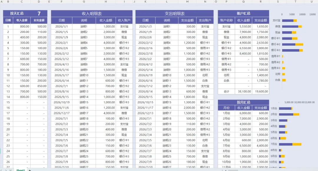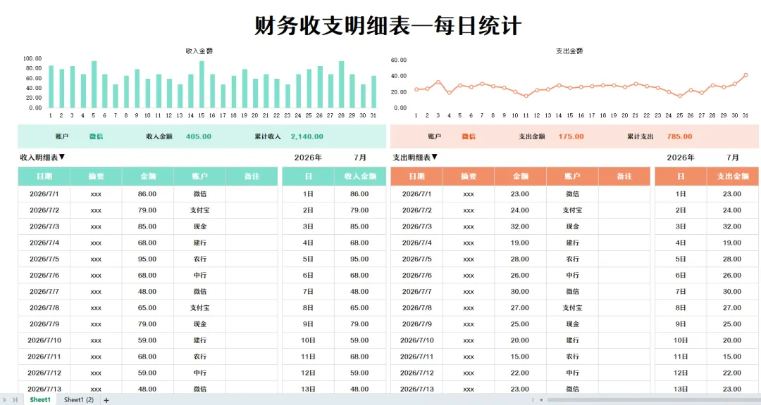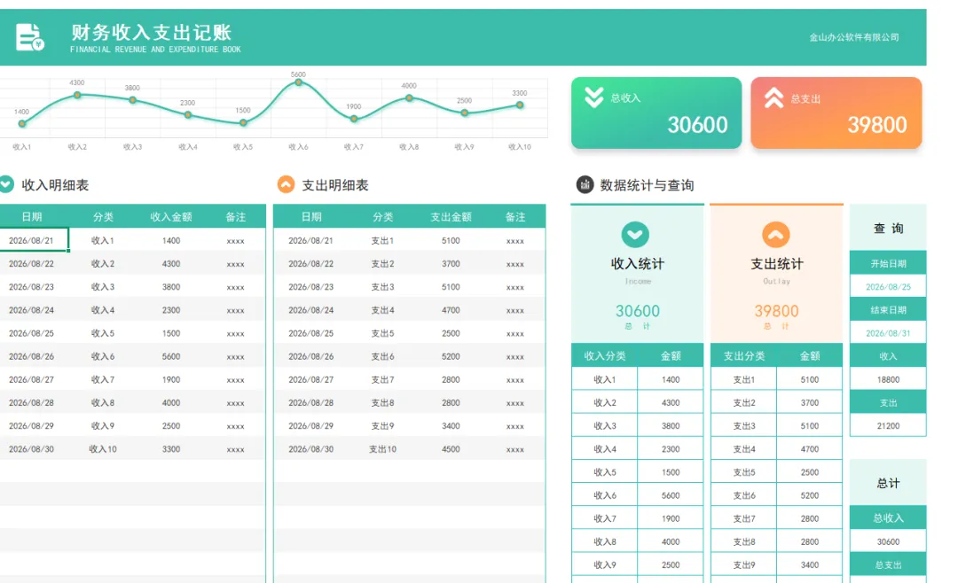 公司每日收支明细表模板,都设置了自动统计的函数公式,带入基础的财务数据后,自动生成可视化收支明细表!具体见下文!