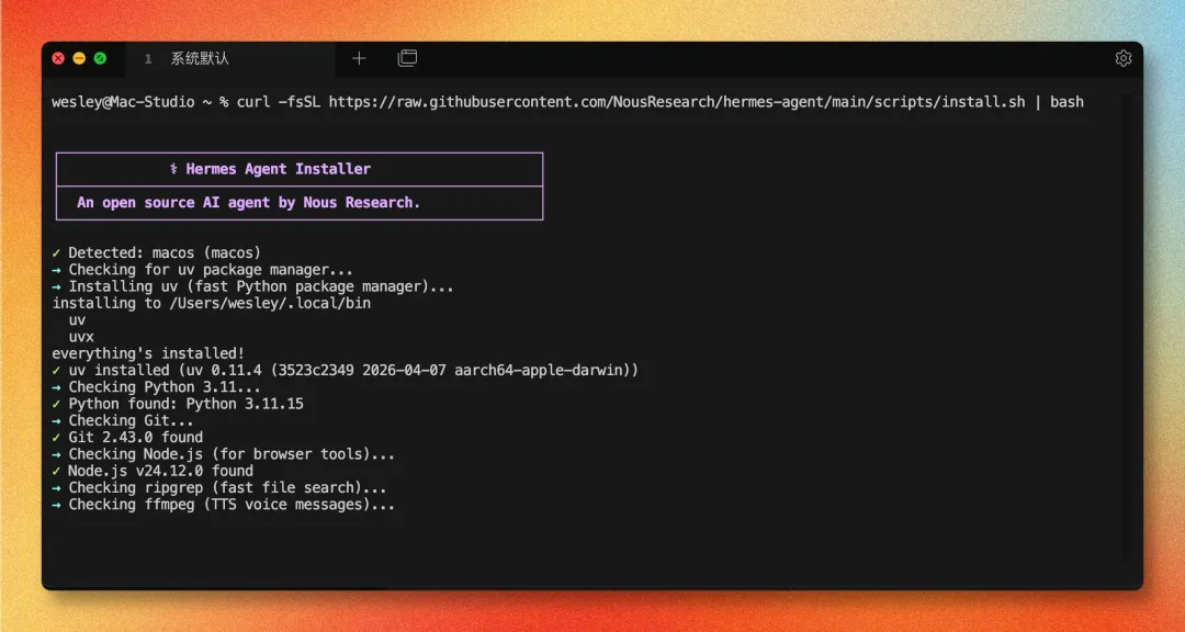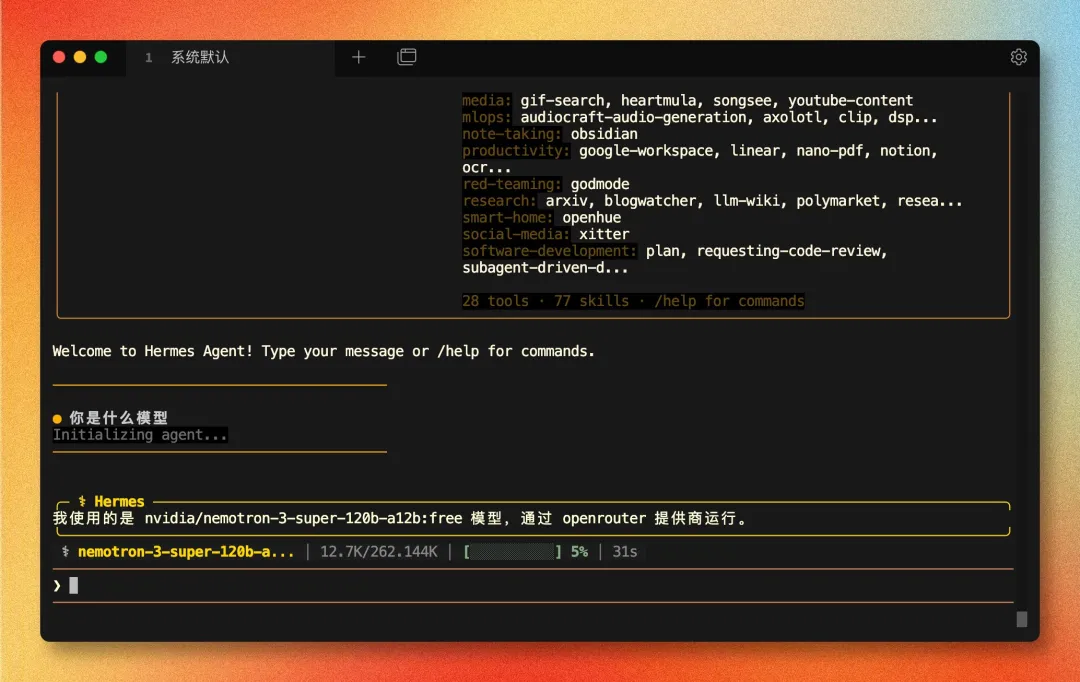配置完成后,运行 hermes,如果能看到欢迎页,说明主体安装已经成功。