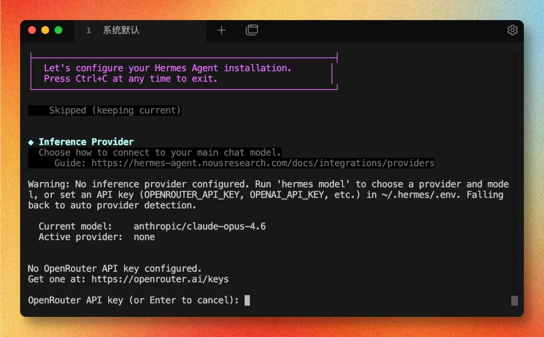 接下来会让你输入模型提供商相关信息。最省事的方式,是先用 OpenRouter。