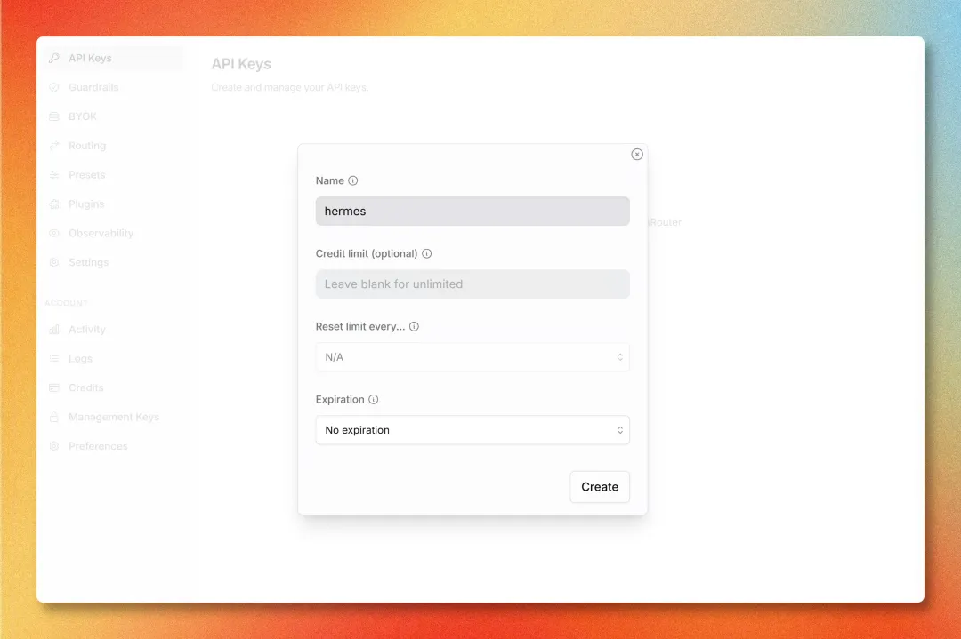 打开 Key 页面 点击 Create Key名字填 hermes创建后立刻复制保存