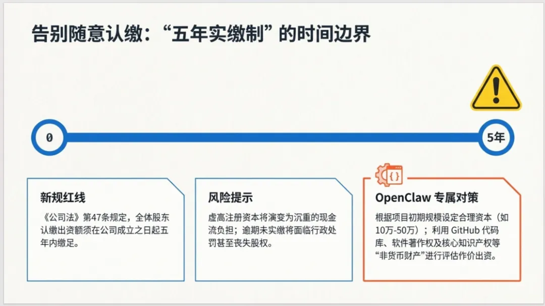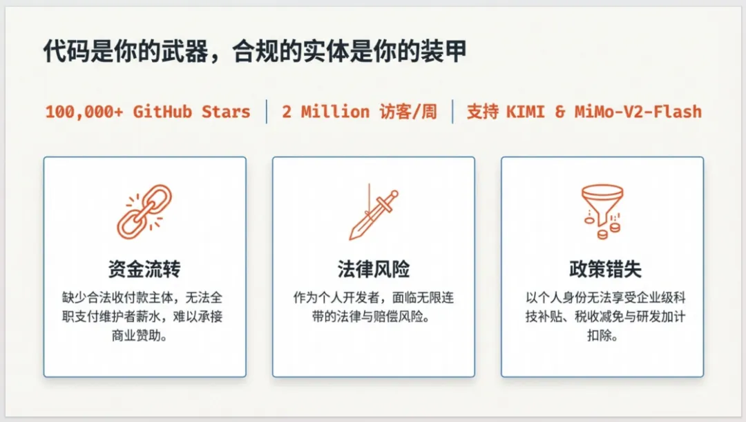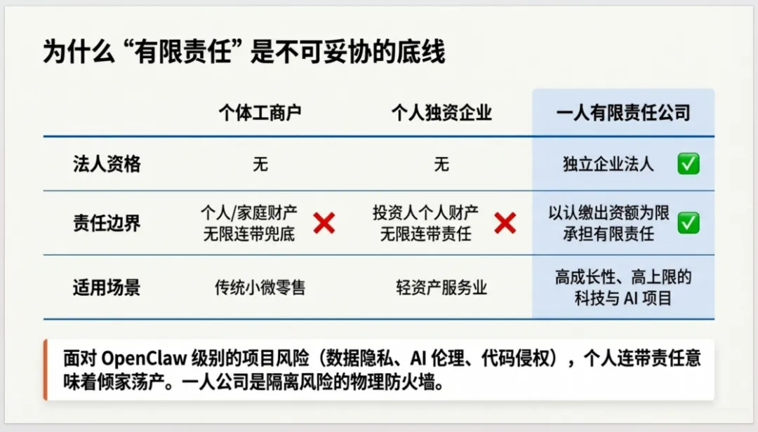 这份《Openclaw一人公司商业化实战指南:进化为超级个体》指南为独立开发者与开源项目构建了一套从技术创造到商业合规的完整生存框架,将个人能力升维为具备可持续性与风险抵御力的法人实体。它精准回应了高成长性科技项目在缺乏合法主体时面临的三大核心困境:资金流转受限无法支撑全职维护、个人承担无限连带法律风险、以及错失企业级财税优惠与补贴政策。指南以2023年新《公司法》为基石,彻底扭转了一人公司的传统监管逻辑,使其从“特殊监管对象”转变为受普惠鼓励的“常规法人”,为超级个体解除了制度紧箍咒。其核心价值在于提供了清晰的风险隔离与合规增效路线图。它首先确立了“有限责任”作为不可妥协的底线,通过对比不同市场主体形态,明确指出一人有限责任公司是隔离AI伦理、数据隐私等前沿风险的唯一物理防火墙。进而,指南系统性地拆解了新法环境下的关键操作节点:包括在五年实缴制下设定合理资本并利用知识产权作价出资、构建极简治理结构、以及阶梯式利用增值税减免与“六税两费”减征政策以降低运营成本。尤为关键的是,指南揭示了将技术投入直接转化为财务优势的政策引擎,即研发费用100%加计扣除制度,这实质上是政府为技术试错成本提供了隐性补贴。同时,通过选址策略(如深圳、海南、上海)与人才招聘补贴的叠加,指南展示了如何将区域政策红利转化为项目启动资金与持续运营燃料。最后,它严厉警示了财产混同这一致命风险,并给出了账户隔离、交易留痕、年度强制审计等日常财务合规的刚性铁律,确保公司“装甲”不被司法穿透。