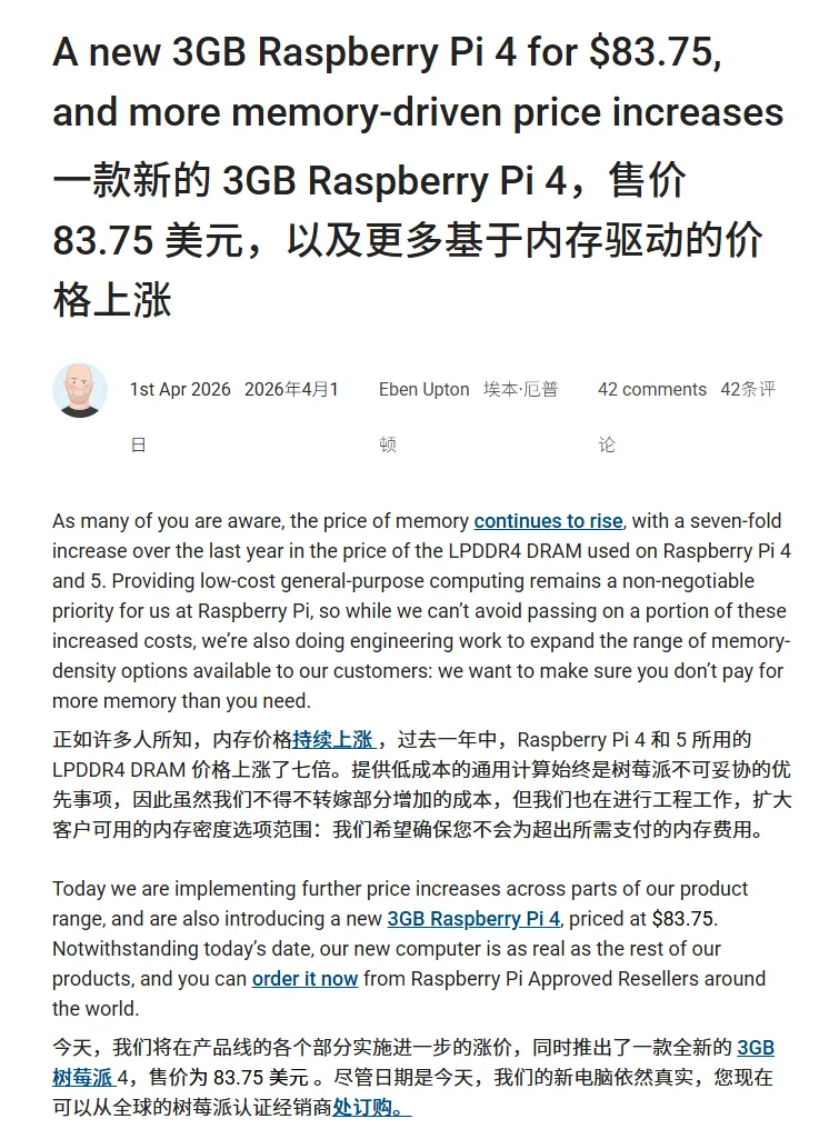 尽管发布日期是 4 月 1 日,但 Eben Upton 在文章中明确强调这不是玩笑。为了缓解压力,官方甚至专门推出了一个 3GB 显存版 的 Pi 4(售价 $83.75),试图在 2GB 和 4GB 的巨大差价间给开发者留个“活口”。