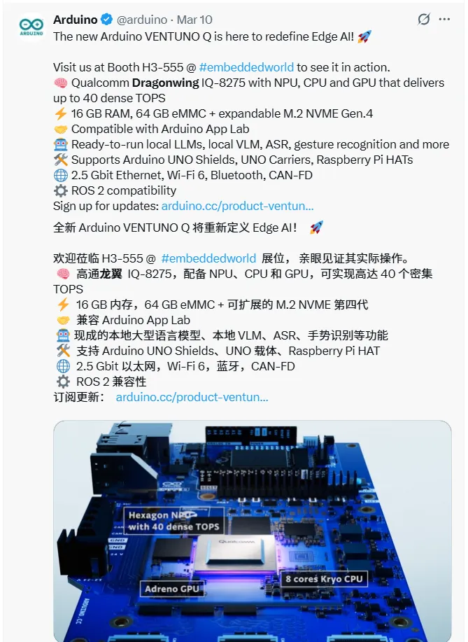 3 月份的 Embedded World 2026 上,Arduino 推出了基于Dragonwing的 Ventuno Q。