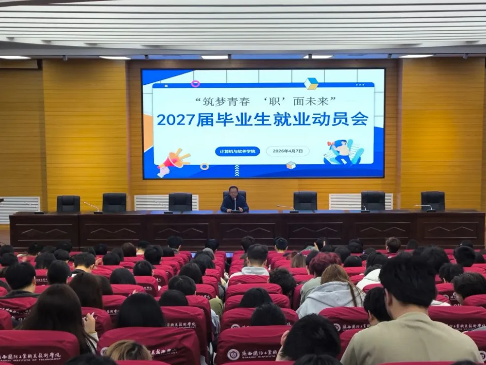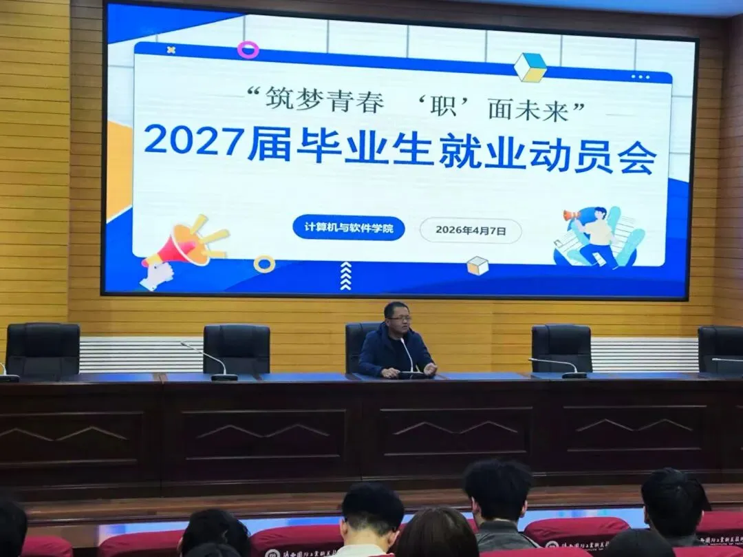 为深入贯彻落实中、省及学校关于高校毕业生就业工作的部署要求,帮助2027届学子进一步明晰职业发展路径、把握行业机遇、提升求职竞争力,4月7日晚,计算机与软件学院在教四学术报告厅召开主题为“筑梦青春 ‘职’面未来”的2027届毕业生就业动员会,党总支书记王勃出席会议并作就业动员,全体毕业班辅导员同500余名2027届毕业生参加会议,会议由学生科科长周睿主持。