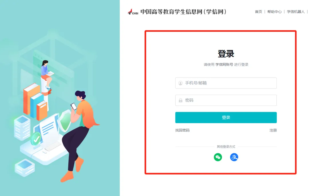 (注:已注册用户可以直接使用学信网账号登录;如遗忘账号密码,可通过"找回用户名/密码"功能重置)