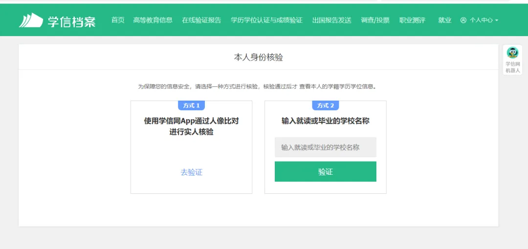 第一次需要先绑定你的学校:选择第三项,输入学校名称,例如“国家开放大学”,点击验证,即可查看到学籍学历信息。如果还未毕业,只能看到学籍信息。