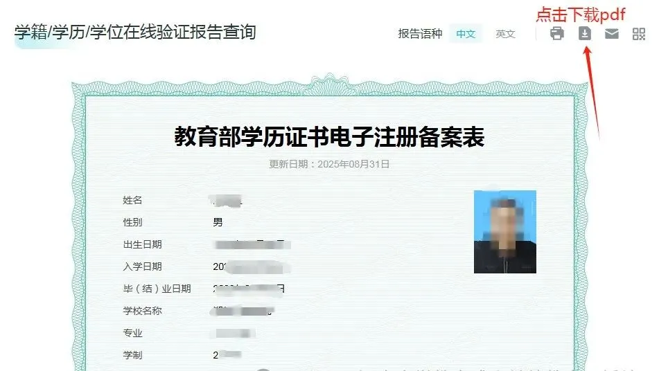 ✅点击右上角的第二个图标”PDF,下载《学历证书电子注册备案表》后保存好即可。