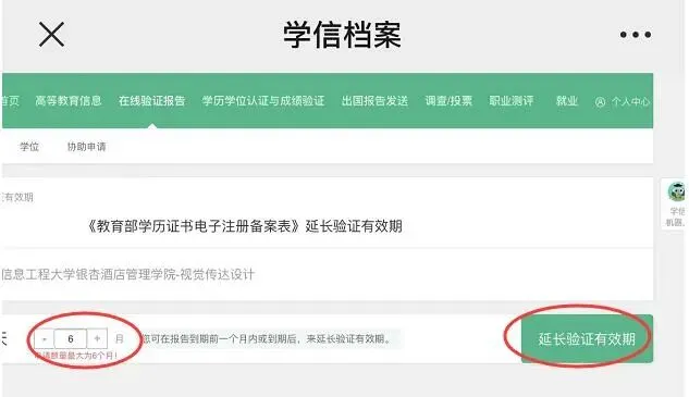 下一步,申请前,先把有效期延长到6个月,默认是一个月有效期。(如果提交该资料进行审核效验时,报告已经过了有效期,审核是通过不了的,只能由学生本人登录学信网账号再延长有效期,以便相关单位进行资格审验。)