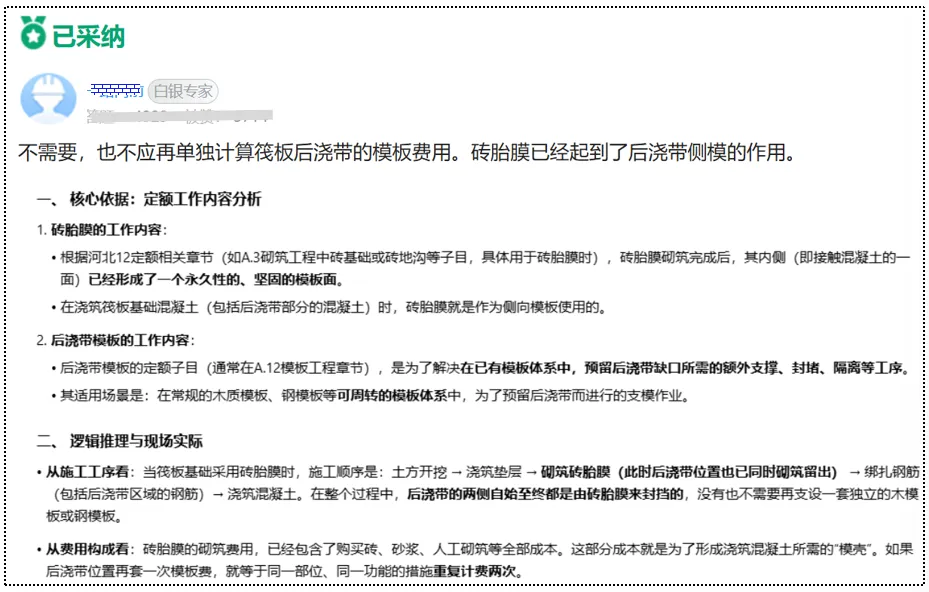 在线的答复是: 1、“不需要,也不应再单独计算筏板后浇带的模板费用,砖胎模已经起到后浇带侧模的作用。” 还贴了一段洋洋洒洒荒唐的AI话。