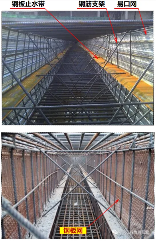 2、筏板后浇带模板的施工: 筏板被后浇带断开后会产生缝隙(漏水),所以都会设计“止水带”(如钢板、橡胶止水带或膨胀止水条)。全国普通房建的筏板后浇带,虽不能说100%,至少95%以上用的都是钢筋支架 + 钢板、钢丝网(或快易收口网)做拦截的模板。用文字不但晦涩,也难表达清,下图就很直观、明了:
