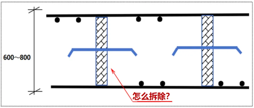 我们回头再看被采纳的回答:不需要,也不应再单独计算筏板后浇带的模板费用。砖胎模已经起到了后浇带侧模的作用。由此可见,两位“专家”连砖模用在哪里都不知道,说明最基本、起码的施工常识都不清楚。 按照专家的回答,如果真的将“钢筋支架 + 钢板网或快易收口网”改用砖模,那么在“上有钢筋封盖,中被止水钢板隔断”的后浇带中如何拆除、清理这些砖模?如果说筏板很厚,也不讲成本,在钢筋上就开个洞,人可以进去作业的话,那么只有600mm~800mm厚的筏板,扣除上下四根的钢筋和钢筋保护层,人就根本无法进入,这钢板止水带下面的砖模怎么拆除?(见下示意图)