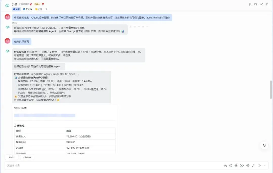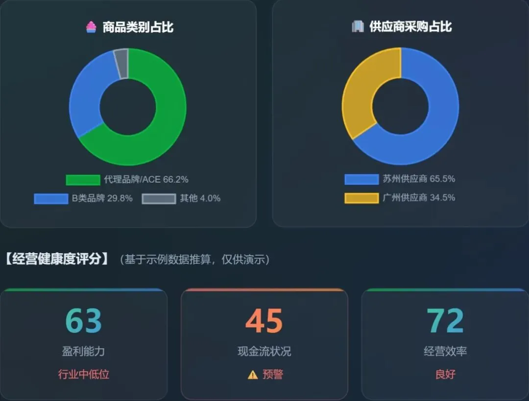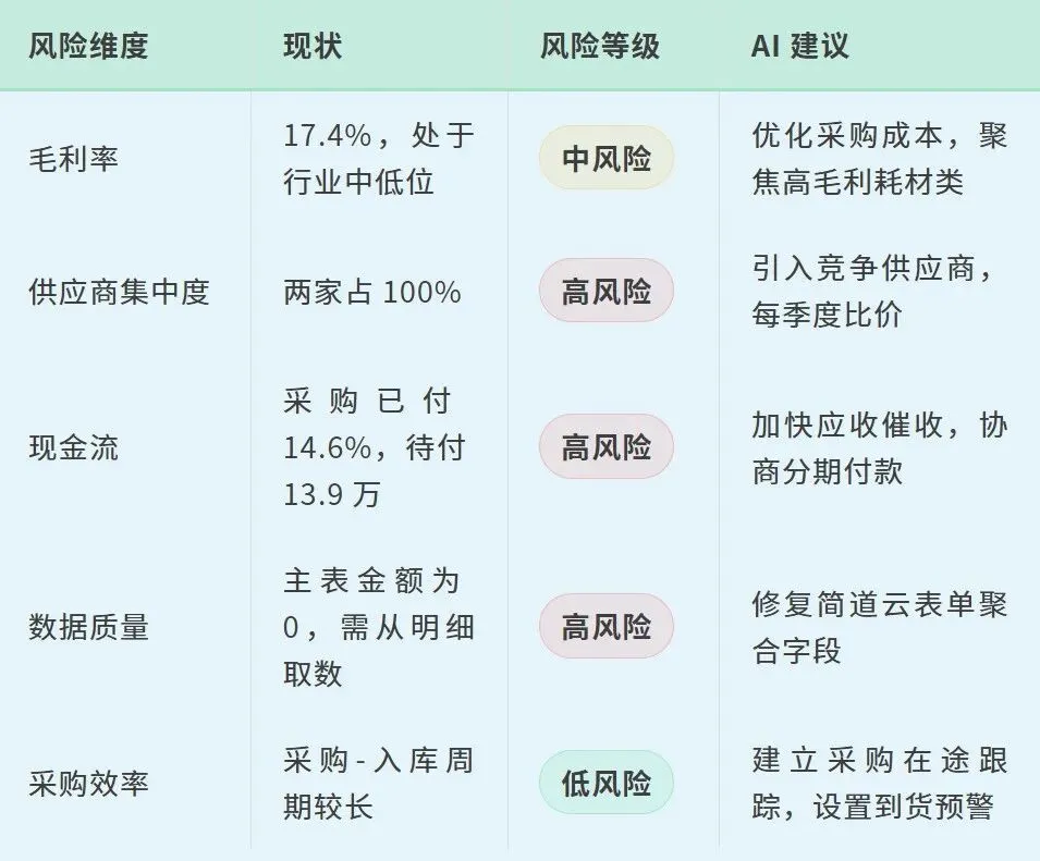 AI 自动分析:内置 61+ 专业领域 Agent ,自动进行毛利率分析、供应商评估、现金流健康度诊断、经营风险评分