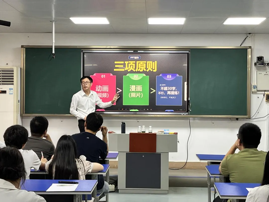 培训中,赵建初主任以《美术篇:基于AI工具支持下的课堂教学设计与创新实践——以Deep Seek、即梦等工具为例》为主题,结合自身丰富经验,直击当前课件制作中内容繁杂、结构松散、视觉单一等痛点,提出“视频优于动画、动画优于文字”的PPT优化三原则,强调每页内容提炼不超过30个字,通过结构化、可视化设计减轻学生认知负担。