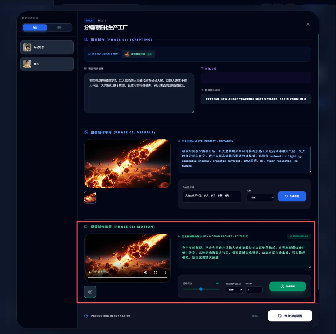 资产一致性关联 (Asset Consistency):通过 CharacterDesigner 提前锁定视觉身份,后续所有分镜都会自动关联这些预设资产。