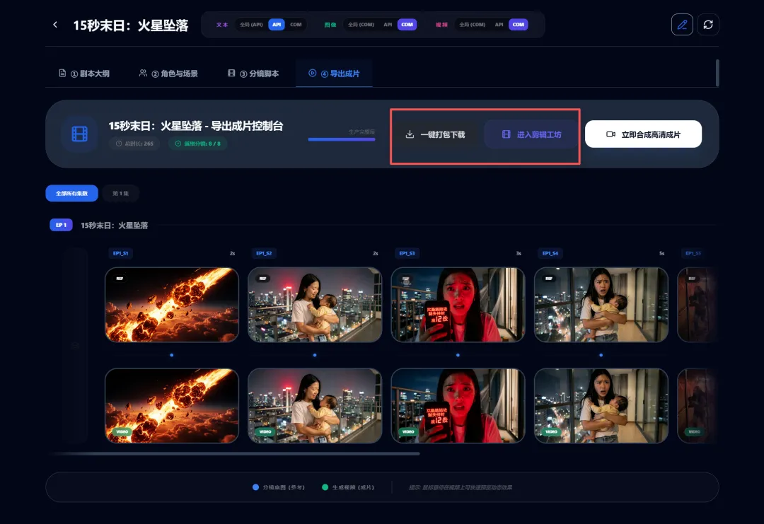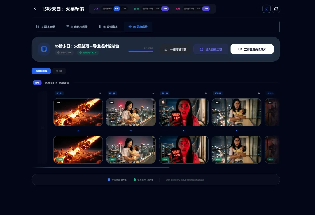 工业级约束 (Industrial Constraints):Agent 并非随意发挥,而是受限于“时长红线”。例如:15秒的短剧,StoryPlanner 会强制将其规划为 1 集,ScriptWriter 则会强制将其拆解为固定数量的分镜,确保后期能对齐。