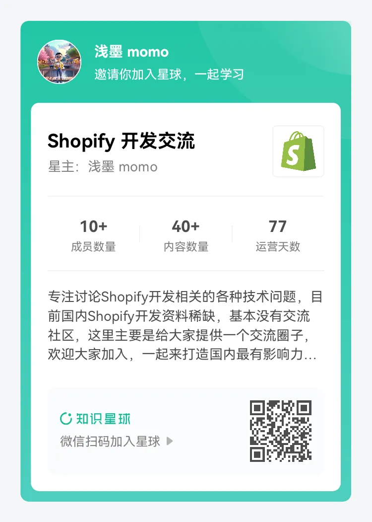 目前国内Shopify开发资料稀缺,基本没有交流社区,所以我创建了一个专注讨论Shopify开发相关的各种技术问题的交流圈子。在这里你可以获得: