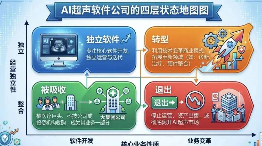 抛开技术路线与产品能力差异,整个行业经过五年洗牌,AI超声软件领域的格局大致收敛为四种状态:退出、被吸收、独立软件、主动转型。每一类状态背后,都对应着一条截然不同的生存路线。