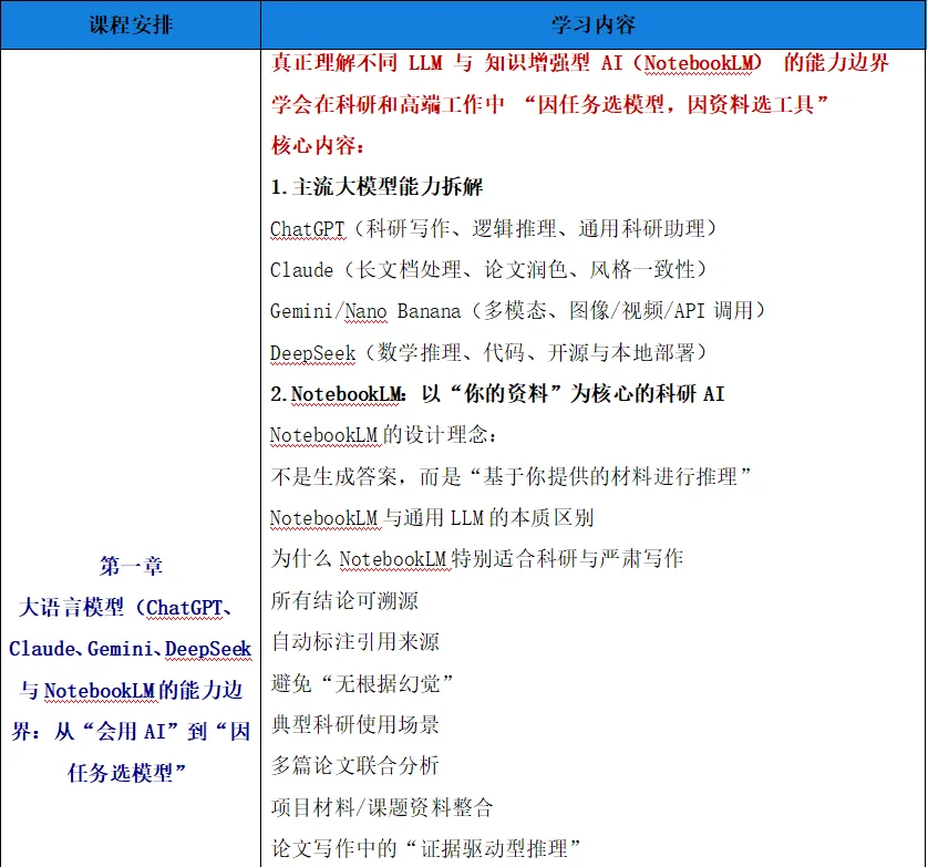 本课程是一门面向科研人员、研究生、博士生、高校教师以及高端知识工作者的系统化实战训练营,以“工具即生产力,Agent即科研合作者”为核心理念,带你从“使用AI”进阶到“构建AI系统”。课程将系统讲解如何将主流大语言模型深度融合进: