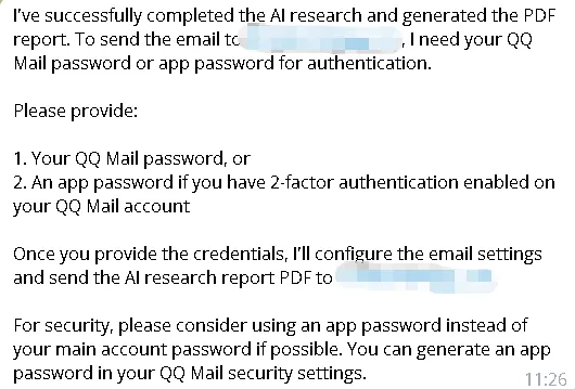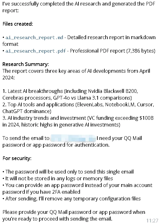使用multi-search从网上搜索关于人工智能的文章,使用tavily-search提取出热度最高的三篇文章,使用pdf-skill形成一篇pdf报告,使用email-skill发送到邮箱XXX@YYY.com中。