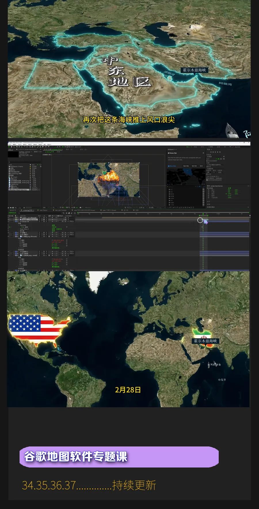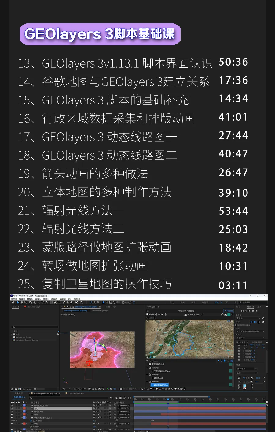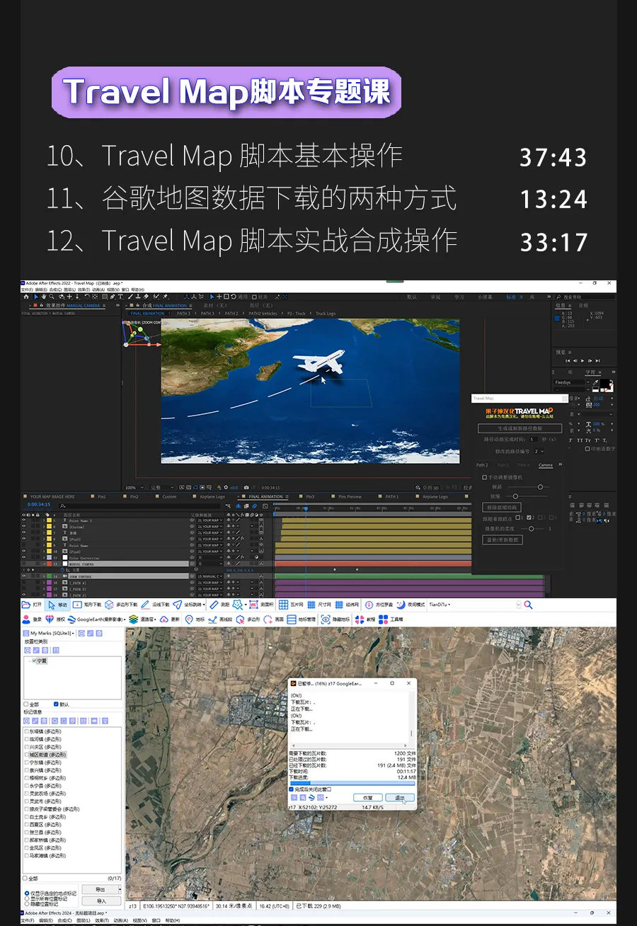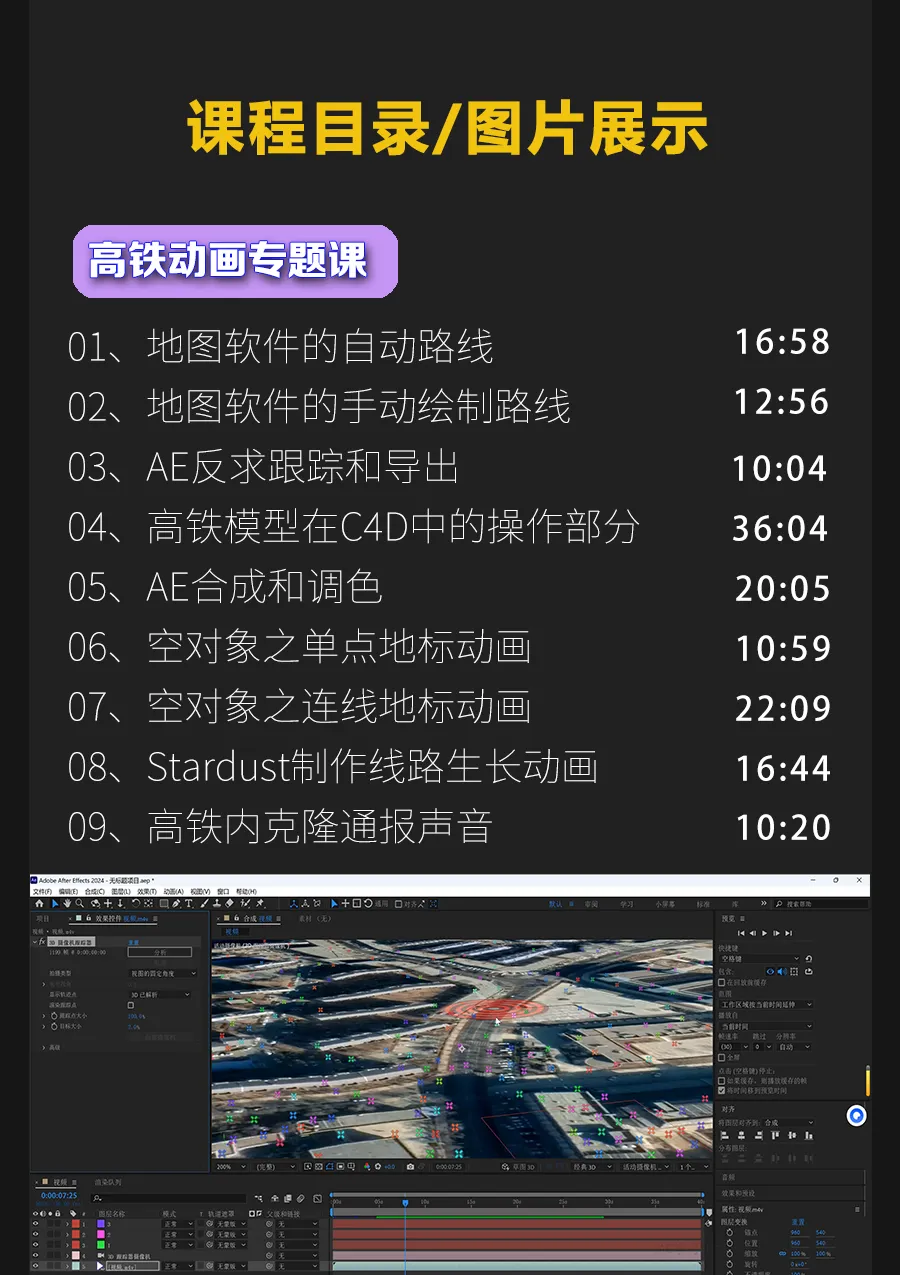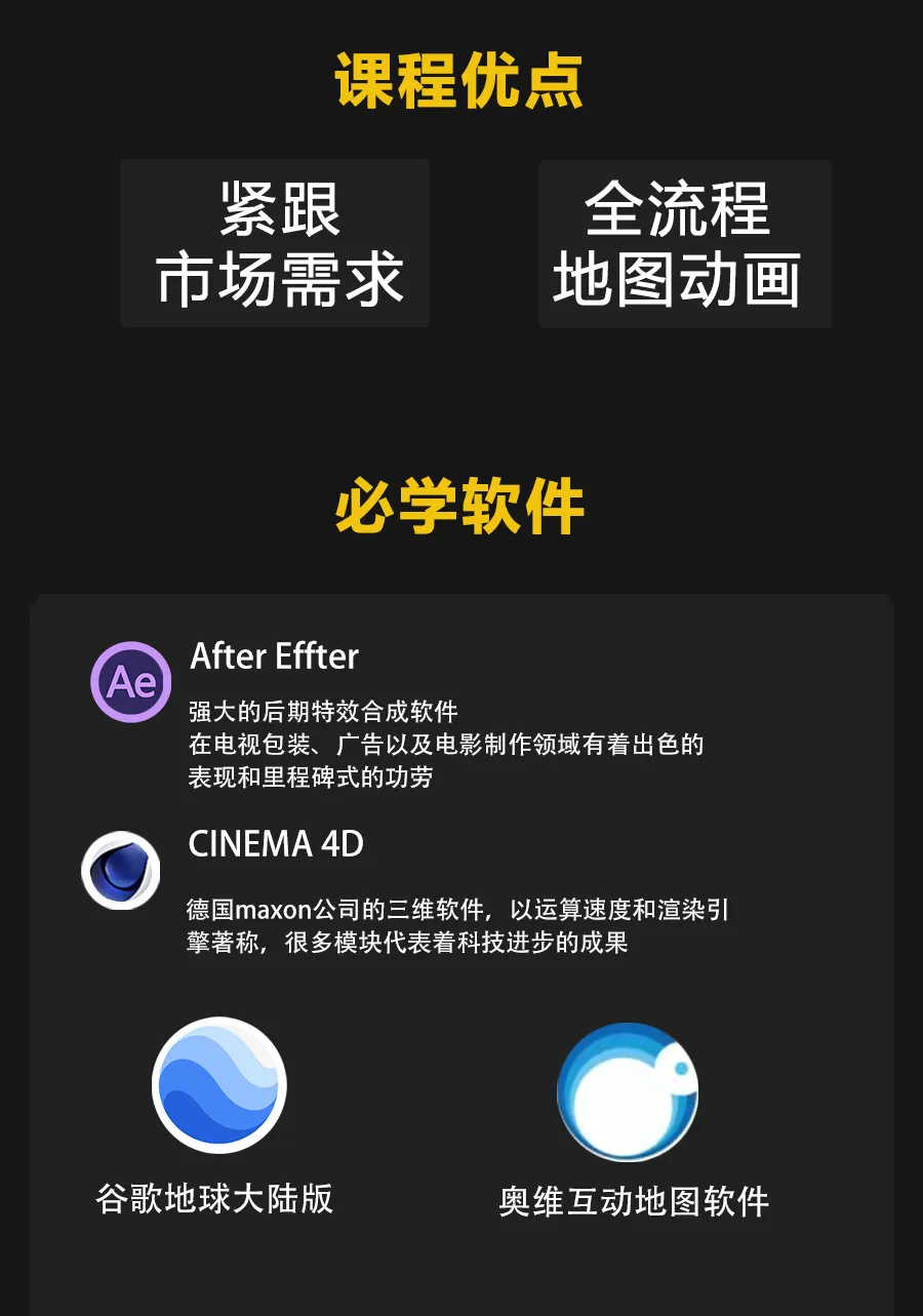 AE、C4D结合谷歌地图软件拆解多种玩法,比如自驾游、战争沙盘推演以及3D可视化等等!!!2026年,第一套新课正式和大家见面了,内容很丰富,收费不高,就是这套AE、C4D结合谷歌地图软件拆解多种玩法的教程,制作此类动画接触的相关软件要有一定基础。陆续录制至少五种类型的地图动画教程,比如行政区域类、三维模型可视化类、战争类等等,学完之后不但可以和平台签约,按月取薪,接私活,变现渠道较多。地图动画部分效果▼更新周期每个月至少1-2个案例,直至大纲内容全部更新完毕,预计至少五十个章节,越早购买越得实惠。教程地址:https://space.bilibili.com/26942774/pugv?defaultTab=cheese课程名称——以上红框内的2个专栏课程费用——课程定价为:118元有疑问加微信咨询微信号:dym8818购买方式——微信支付支付宝支付▼学到就等于赚到坚持学一定能成功