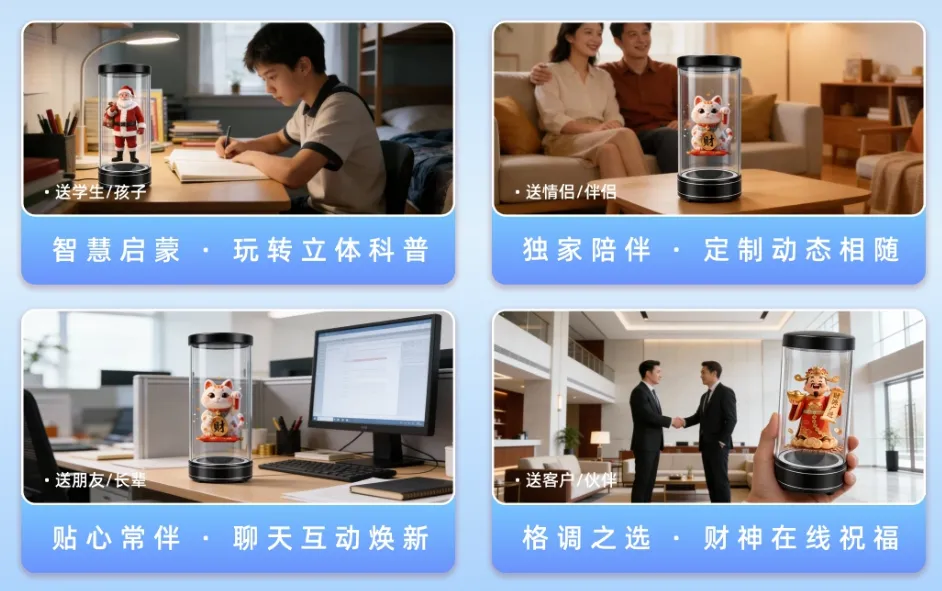 别被它的迷你外形骗了,配置直接拉满,性能一点不缩水!搭载 RK3566 CPU,搭配 4GB LPDDR 内存 + 32GB EMMC 存储,运行丝滑流畅,响应零延迟;6 寸 1280×720 高清屏,16:9 黄金比例,搭配专利虚拟透明显示技术,裸眼就能呈现超逼真 3D 效果,数智人立体悬浮、栩栩如生,裸眼就能沉浸式感受次元互动的快乐。更有 4500mAh大电池款可选,支持 Wi-Fi / 蓝牙连接,内置高清喇叭,不管是放桌面用还是随身带,都能随时开启智能体验。