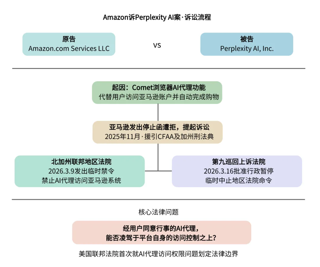 本文将依次介绍:① 案件基本事实与诉讼背景;② 地区法院临时禁令的四要素审查逻辑;③ 第九巡回上诉法院的程序性回应;④ 最终揭示本案确立的核心法律命题——在AI Agent场景下,"用户授权≠平台授权"。
