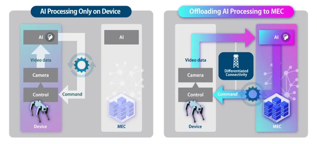 该卸载架构通过一种动态切换机制实现对机器人的最优管控:根据具体情况,切换AI处理任务的执行载体,既可以在机器人一侧执行AI处理,也可以利用MEC平台作为外部计算资源执行AI处理。此外,基于各种应用对时延、吞吐量和可靠性等维度的不同需求,通过实现差异化连接,比如网络切片和优先级控制,可以优化通信网络,从而实现低时延、高可靠性的控制。