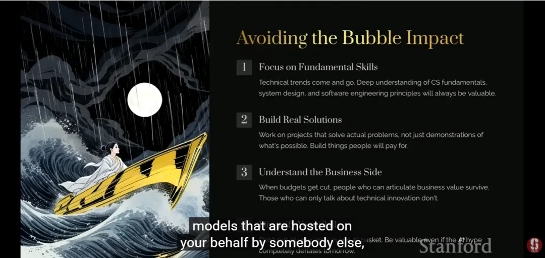 "我知道在某些圈子里,鼓励别人努力工作被认为是不合适的。但我还是要说:请你努力工作。"他紧接着补了一句很温柔的话:我们当然要尊重那些因为身体、家庭等原因暂时无法全力投入的人。但如果你恰好有条件,那周末晚上与其看一集无聊的电视剧,不如打开你的AI编码工具试一个新想法。失败了不过是浪费一个周末,但你会学到新东西。在一个"work-life balance"几乎成了政治正确的时代,敢在斯坦福课堂上对一群即将毕业的学生说"请你努力"——这本身就是一种勇气。而且他的逻辑很清晰:AI让试错成本大幅下降了。以前一个想法可能需要几个月才能验证,现在一个周末就能跑通MVP。当失败的代价变低了,不去尝试才是最大的浪费。看完这堂课,我最大的感触是:所有人都在讨论AI能做什么,但真正值钱的问题是——你能用AI解决什么。Moroney有句话说得好:"不要让你的产出匹配你现在的工作,要让它匹配你想要的工作。"这句话对做AI的人适用,对做内容、做产品、做投资的人也一样。工具一年比一年强,但工具不会替你思考"这件事值不值得做"。如果你也关注AI行业的真实动向而不只是热点噪音,欢迎关注赋沸点AI,我们只聊有信息密度的内容。来源:Stanford CS230 | Autumn 2025 | Lecture 9: Career Advice in AI讲者:Andrew Ng(吴恩达)、Laurence Moroney==============================
