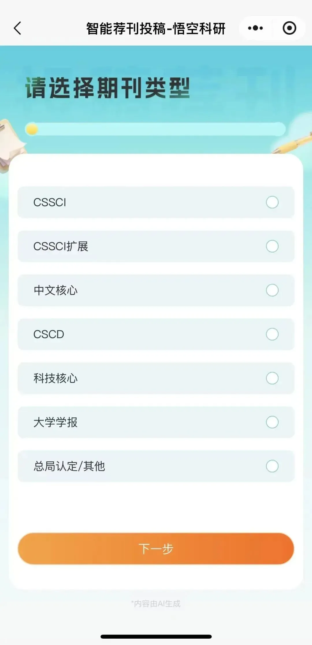 2、点击“填写论文信息,寻找属于我的专属期刊”,进入“选择期刊类型”页面;