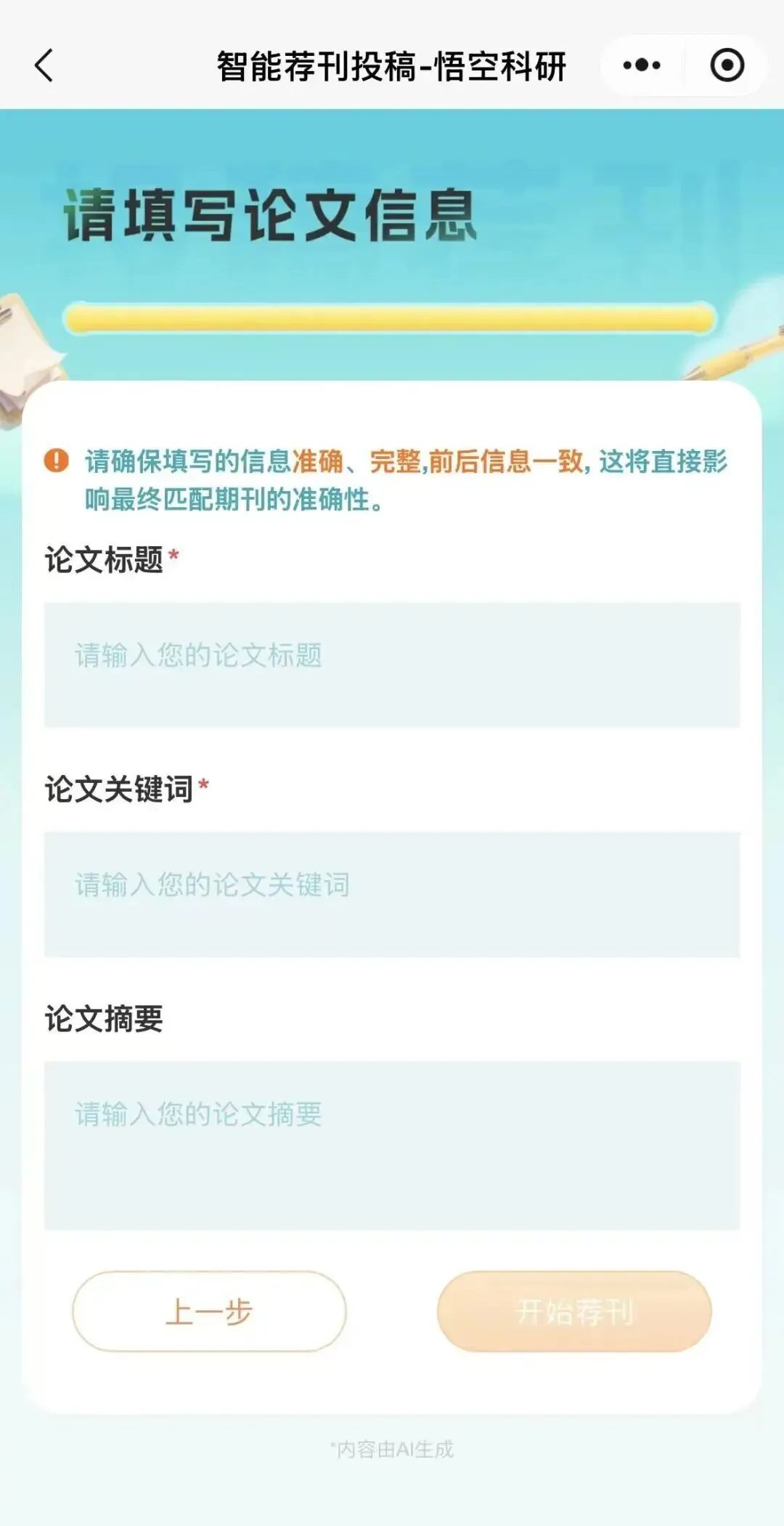 4、填写论文信息(包括论文标题、论文关键词、论文摘要),开始荐刊;