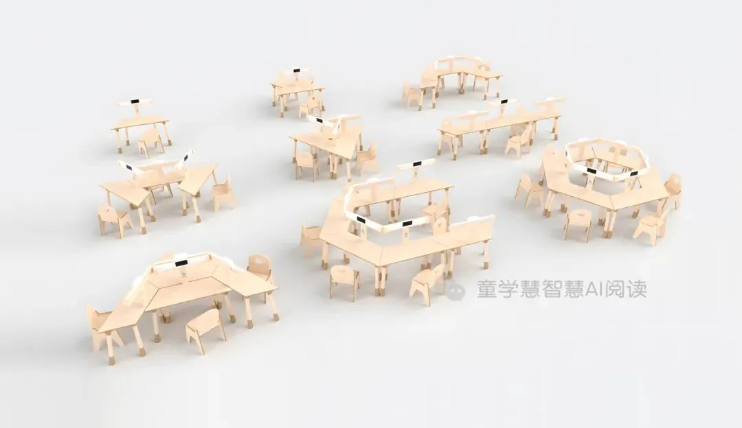 童小阅AI伴读桌采用灵活设计,完美适配幼儿园各类场景。支持2-6人位自由组合,最小占地仅1㎡,既能作为独立阅读区,也能拼接成小组互动区,引导幼儿开展集体阅读、分享交流。无论是教室的小角落、走廊的空闲处,还是活动室的公共区域,都能快速搭建阅读场景,让阅读无处不在,真正实现“让阅读融入一日生活”的政策要求。