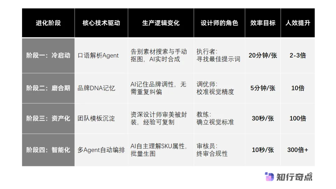 我们根据跨境电商的实际链路,将「AI电商素材制作系统」提效总结为四个关键阶段。这不仅是工具的熟练过程,更是企业数字资产的增值过程: