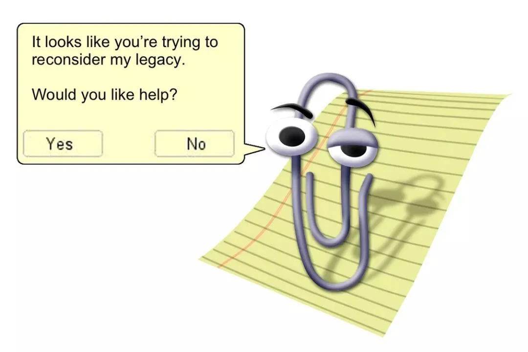 不过可能比尔盖茨意识到这个卡通形象非但不能提高效率,反而容易让人分神,所以在 2001 年宣布 Clippy 先生退休。