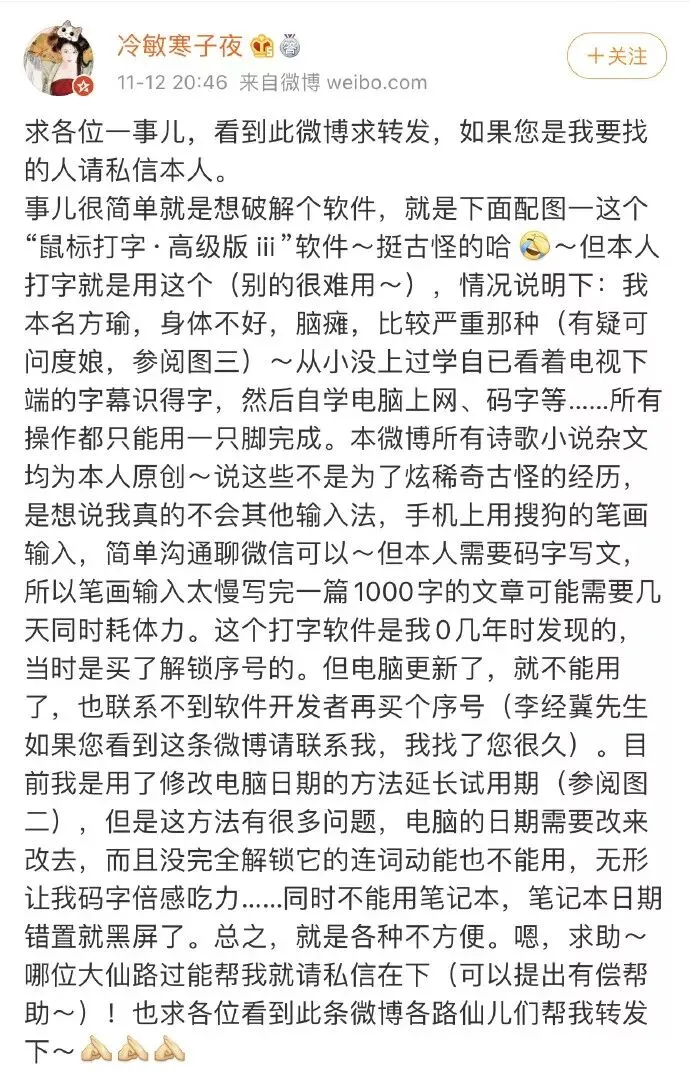 前不久,方瑜的电脑更新了,原先的“鼠标打字·高级版ⅲ”也找不回来,只能尝试性的发表寻找开发者的微博。