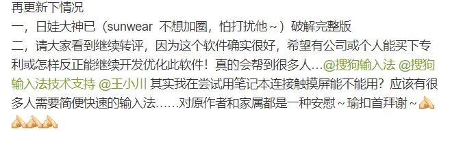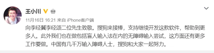 于是搜狗输入法王小川表示:向李经冀李经颂二位先生致敬。搜狗来接棒,支持继续开发这款软件,帮助到更多人。